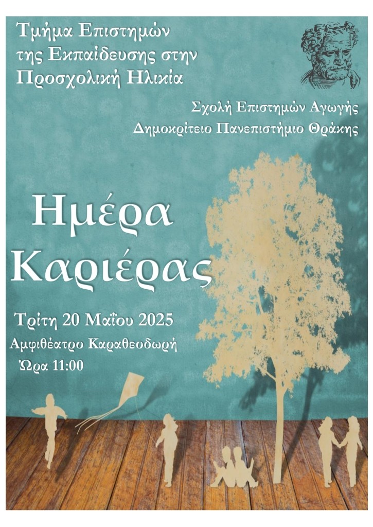 ών της Εκπαίδευσης στην Προσχολική Ηλικία διοργανώνει την Τρίτη 20 Μαΐου 2025, στις 11.00, «Ημέρα Καριέρας» στο Αμφιθέατρο Καραθεοδωρή, της Σχολής Επιστημών Αγωγής, στην Αλεξανδρούπολη.
