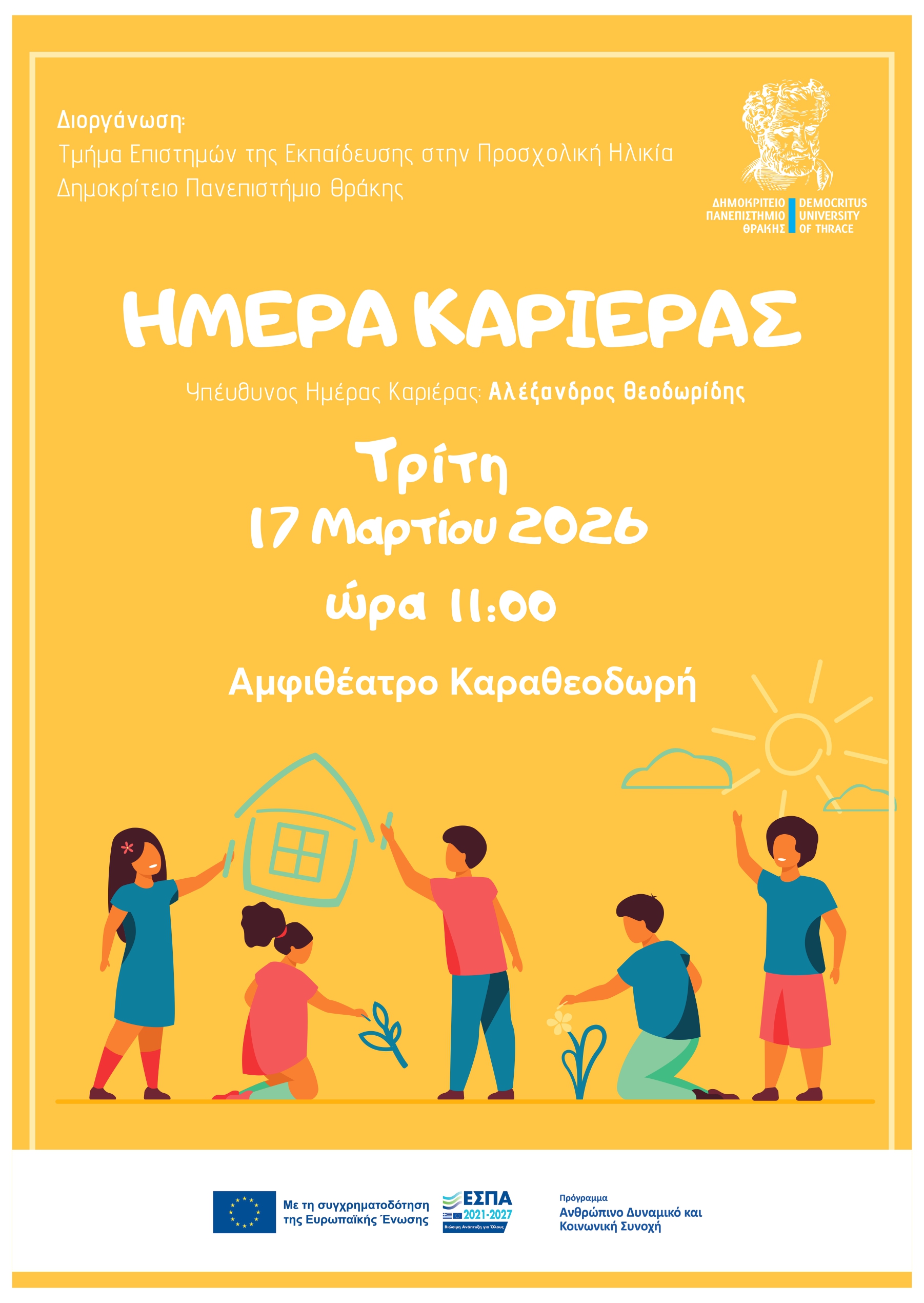 το Τμήμα Επιστημών της Εκπαίδευσης στην Προσχολική Ηλικία διοργανώνει την Τρίτη 17 Μαρτίου 2026, στις 11.00, «Ημέρα Καριέρας» στο Αμφιθέατρο Καραθεοδωρή, της Σχολής Επιστημών Αγωγής, στην Αλεξανδρούπολη.